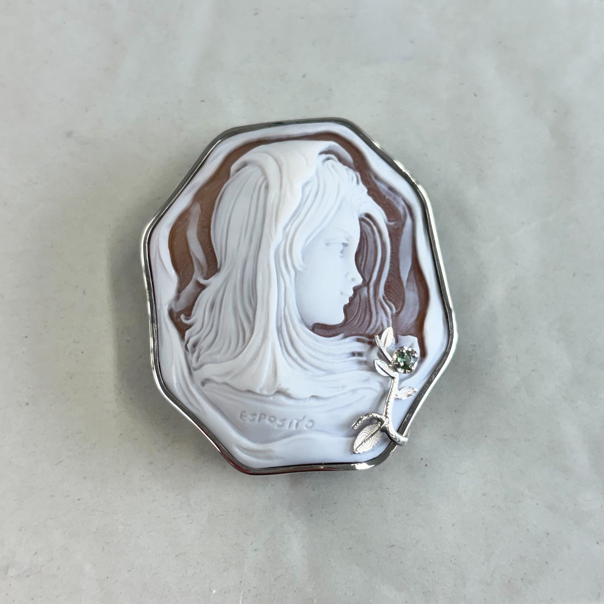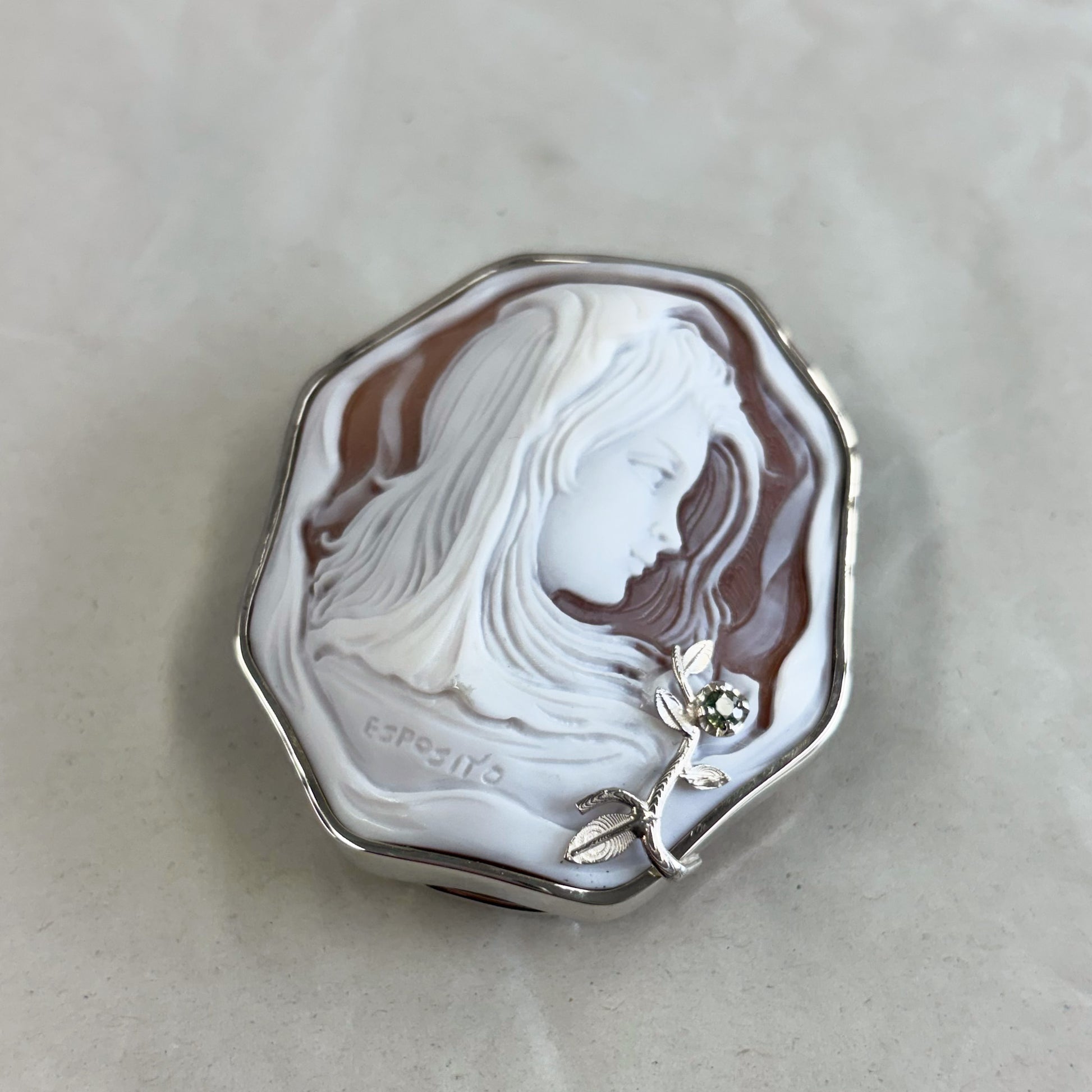 カメオの繊細な彫刻。サファイアがアクセントに。