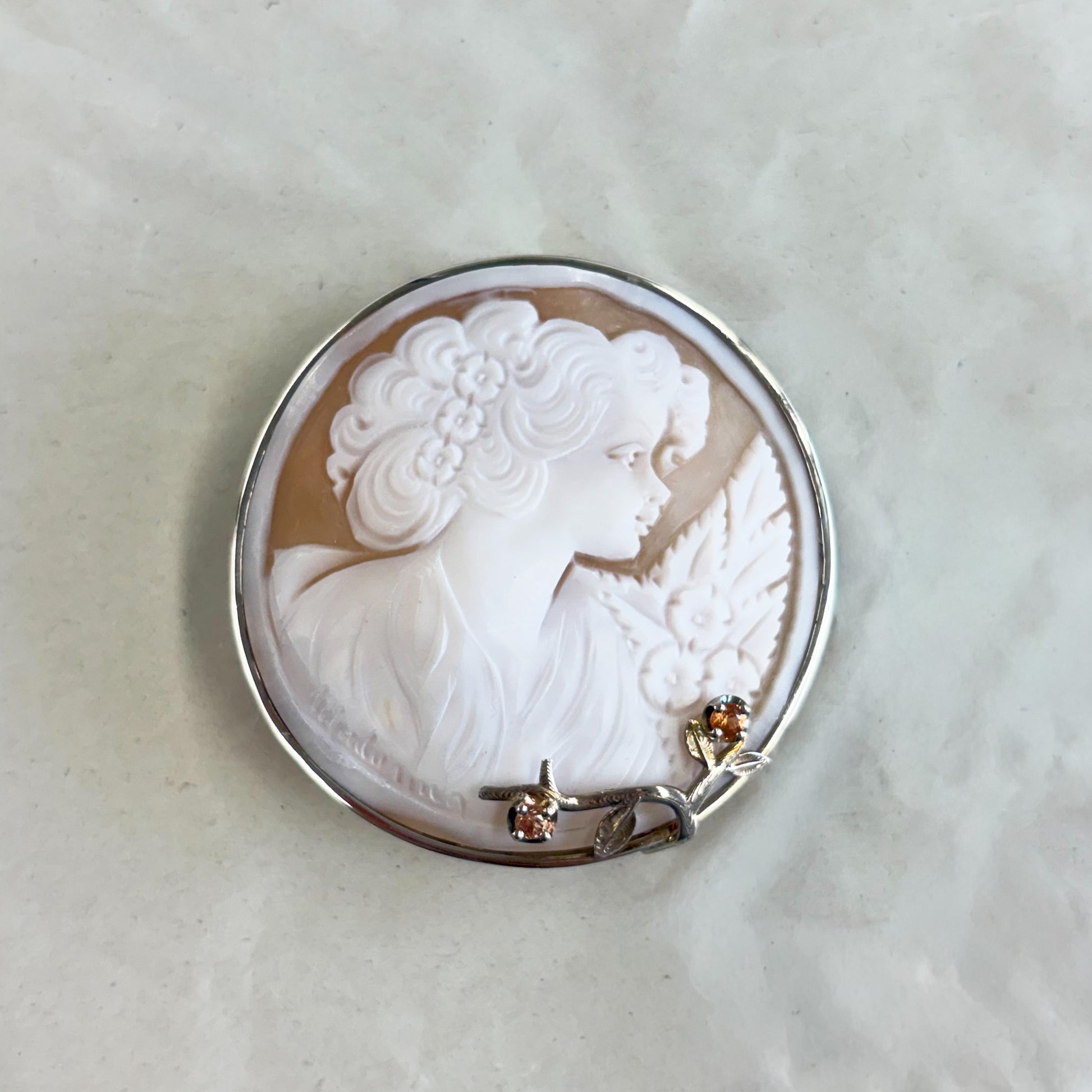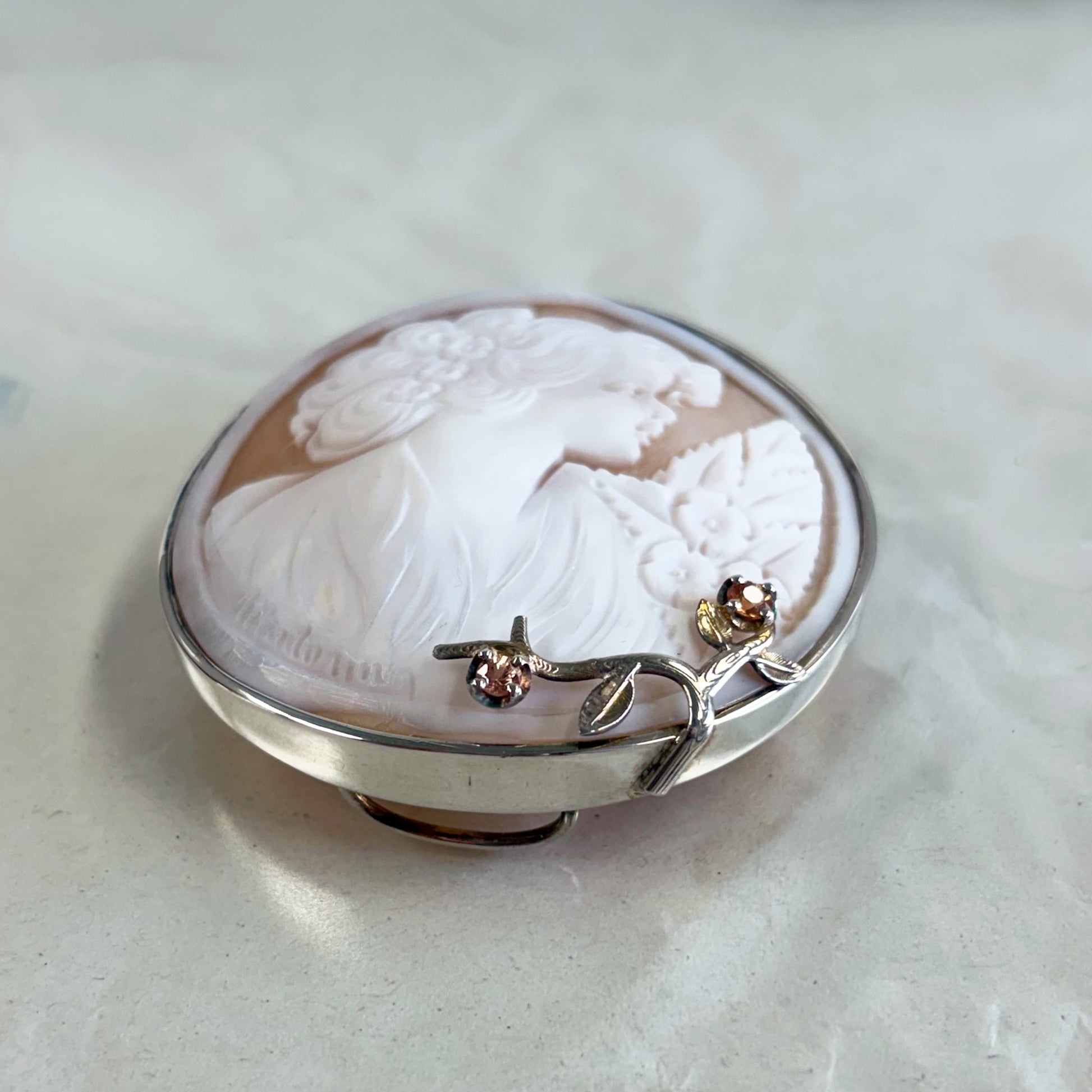 カメオの繊細な彫刻。サファイアがアクセントに。