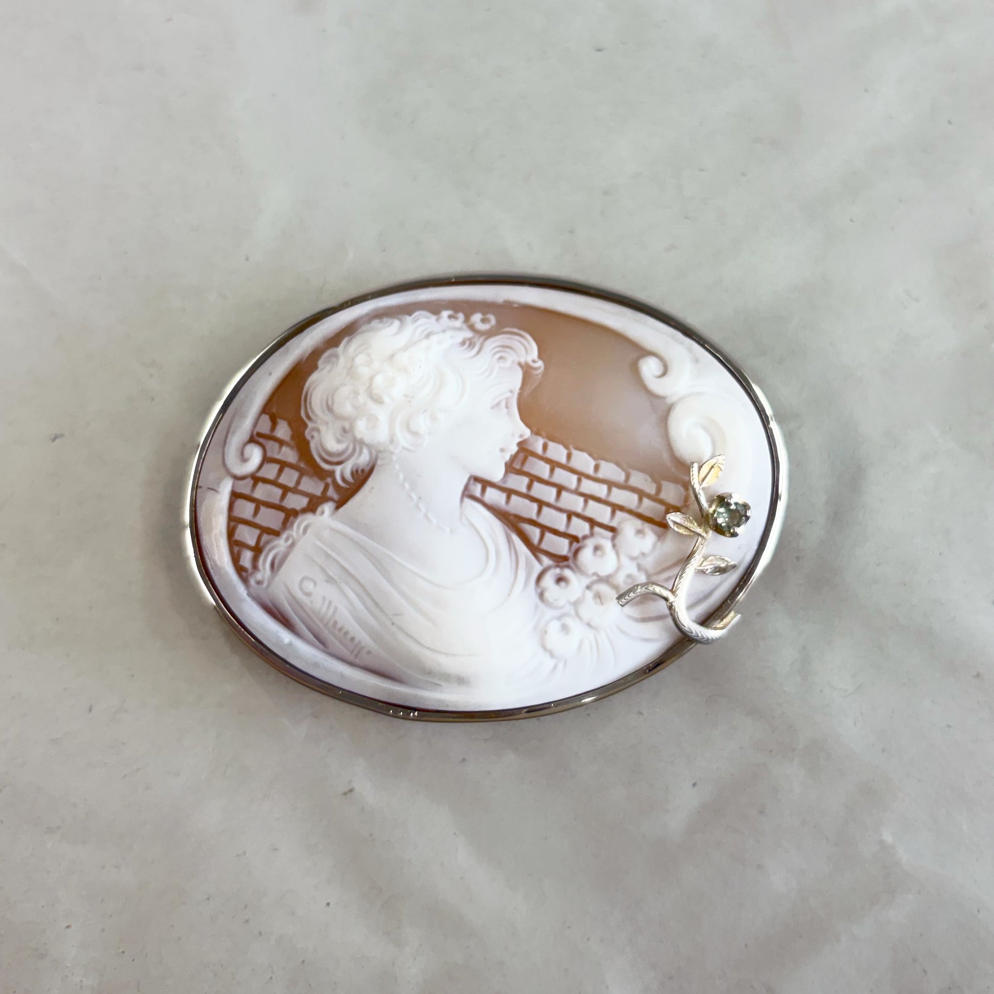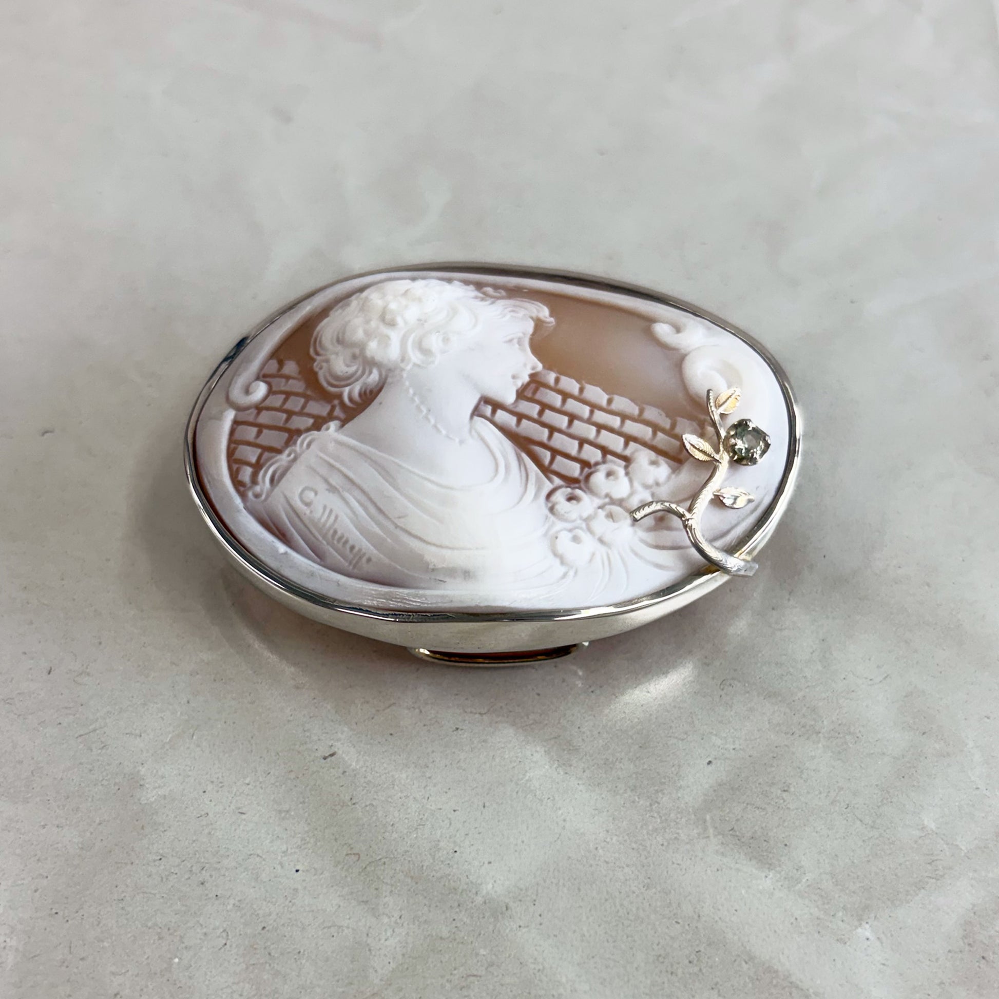 カメオの繊細な彫刻。サファイアがアクセントに。