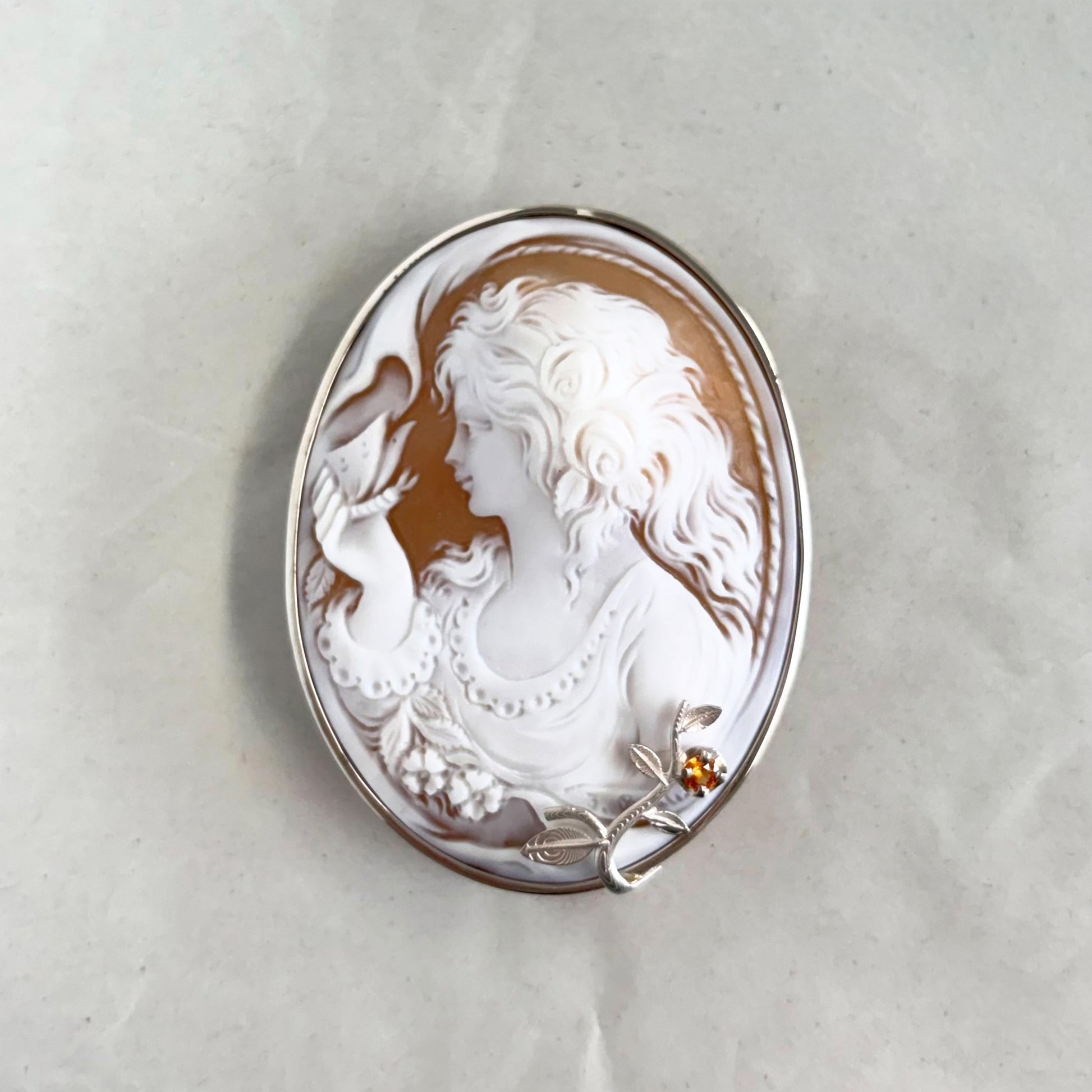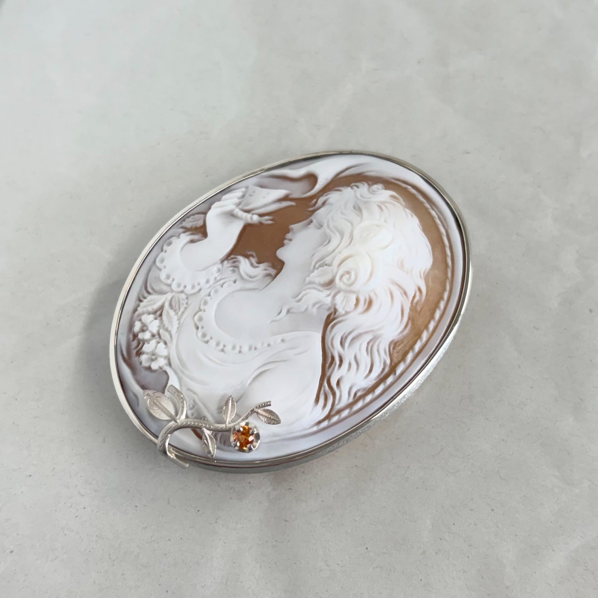 カメオの繊細な彫刻。サファイアがアクセントに。