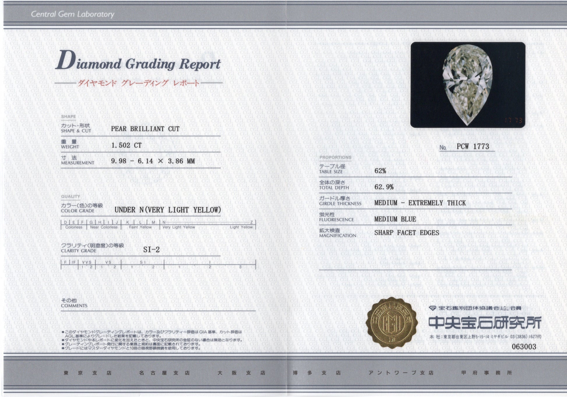 ■鑑定機関 中央宝石研究所 PCW 1773