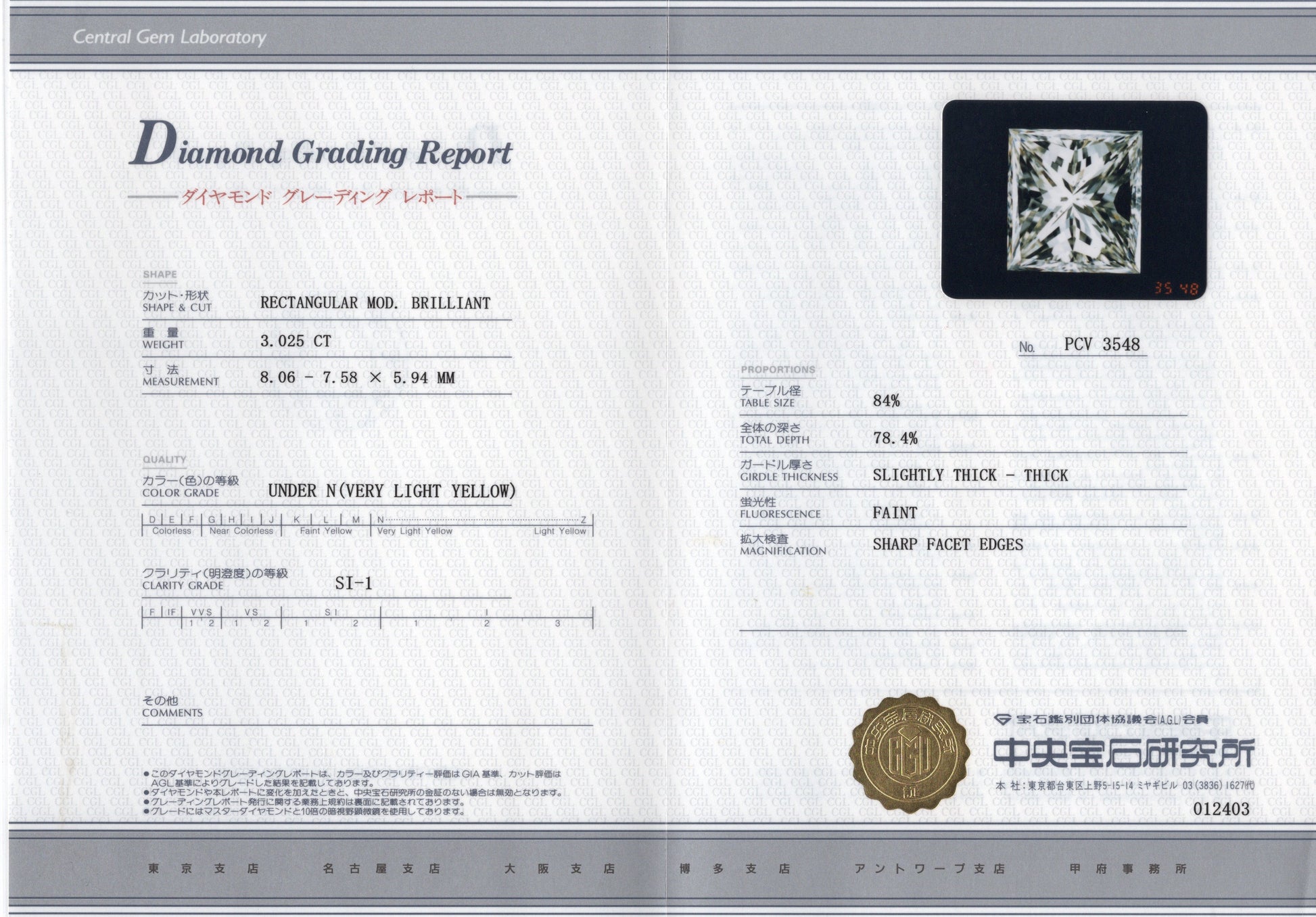 ベリーライトイエローダイヤモンド レクタンギュラモディファイドブリリアント 3.025ct