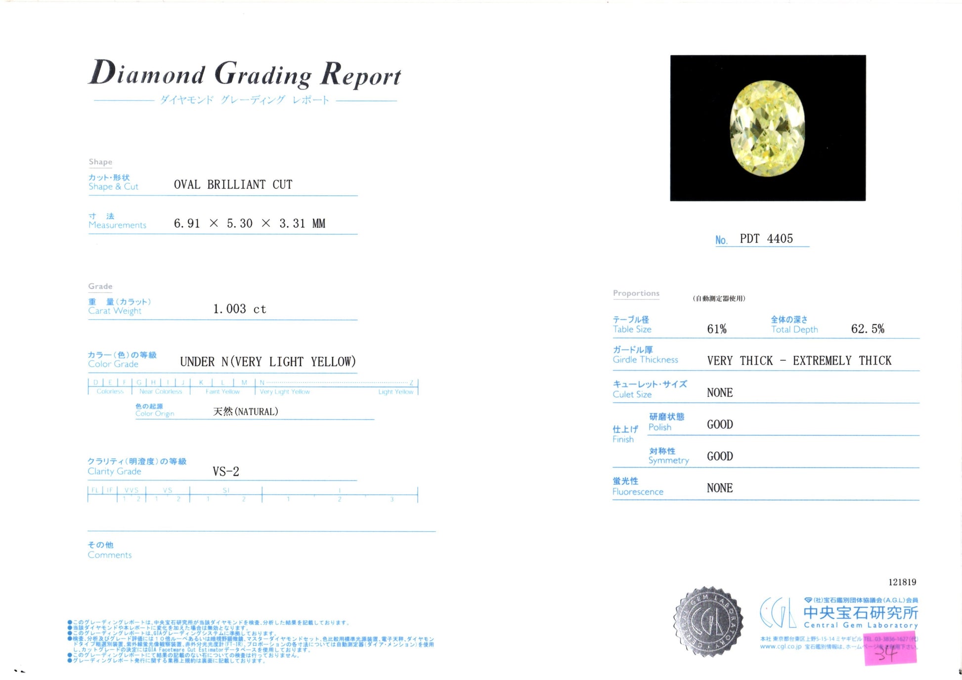 ベリーライトイエローダイヤモンド オーバルブリリアント 1.003ct