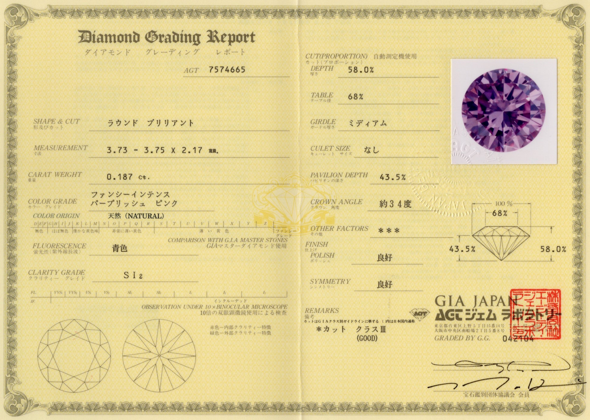 ファンシーインテンスパープリッシュピンクダイヤモンド ラウンドブリリアント 0.187ct