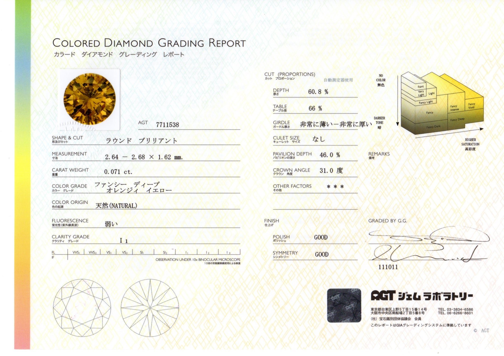 ファンシーディープオレンジィイエローダイヤモンド ラウンドブリリアント 0.071ct